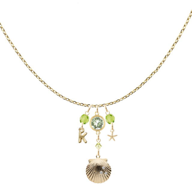 シェルのチャームをメインにスワロフスキーやチェコビーズでデザインしました。イニシャルのチャームもついています。